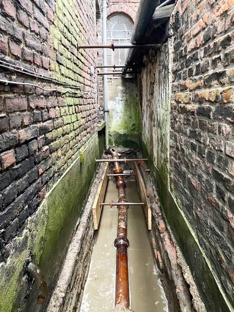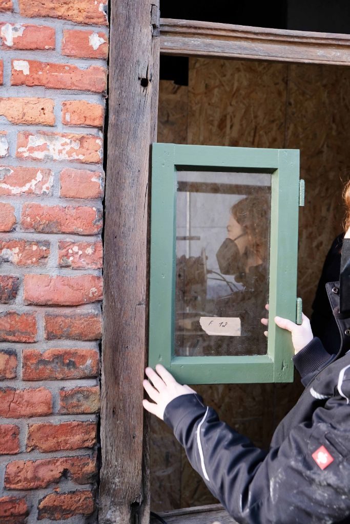 Während aus dem Eckhaus der Stemmhammer ertönt, werden im Denkmal bereits die historischen Fenster und Wandoberflächen behutsam restauriert.