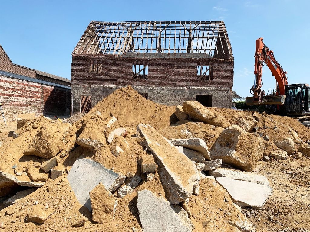 Auf dem Birkenhof in Brachelen geht es voran. Der Abbruch der Nebengebäude ist geschafft, die Grundmauern sowie das bestehende Tragwerk der Scheune werden sichtbar und der Rohbau entsteht!